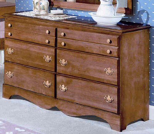 Long lasting, hard wood dresser would make a beautiful addition to any décor. This dresser has six drawers three side by side with sparkling, brass finish handles. This sturdy, well crafted dresser is made in the USA. Accessories not included. Available in maple or cherry finish. Read more...