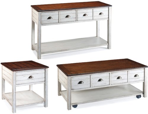 Casual and comfortable with a warm easy living style, the Bellhaven table collection features planked tabletops in a natural cherry finish and a painted alabaster finish. Crafted of cherry Veneers with antique brass hardware this collection features ample storage and functionality with drawer storage on each table Features: Constructed of hardwood solids and cherry veneers Includes sofa, cocktail and end table Finish: Alabaster Dimensions: End Table: 22W x 24D x 24H Cocktail Table: 48W x 24D x 19H Sofa Table: 48W x 18D x 29H Read more...