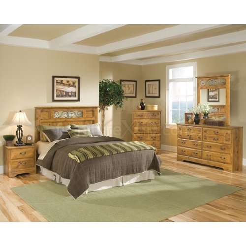 Standard Furniture Scotsdale Bedroom Set (King) 05050-br-set 5066. The Scotsdale Bedroom Set by Standard Furniture from the Scotsdale Bedroom Collection features a charming country style through a blend of simple carvings and eye catching adornments. Scotsdale presents beautiful simulated bishop pine color finish gives a luxurious full bodied appearance that is both warm and bold. Ornamental artwork and interesting detail throughout create a soft and cozy country style. Please Note: Bed is Headboard Only. FREE Bed Frame included. Features: Scotsdale Collection Wood products with simulated wood grain laminates. This group may contain plastic parts. Cast metal. Cast metal adornments on headboard and mirror feature a distinctive simulated dark pewter finish and make the perfect focal point for the entire suite. Surfaces clean easily with a soft cloth. Part of the Scotsdale Bedroom Collection by Standard Furniture Dimensions: 5051 Full / Queen Panel Headboard 4/6-5/0 52"H 5066 King Panel Headboard 6/6 52"H Some assembly may be required. Set Includes: 1 Scotsdale Panel Mirror, 1 Scotsdale 6- Drawer Dresser, 1 Scotsdale Nightstand, 1 Scotsdale Queen Bed (Headboard Only) Read more...